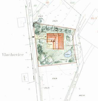 Rovinatá část pozemku je svažitými a ozeleněnými mezemi